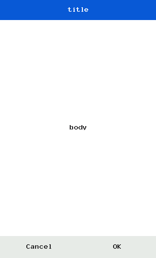Section titled “cinput.ask”cinput.ask( title, body, ok_text="OK", cancel_text="Cancel", theme="light", touch_mode=gint.KEYEV_TOUCH_DOWN)The standard modal alert screen with two huge buttons at the bottom.