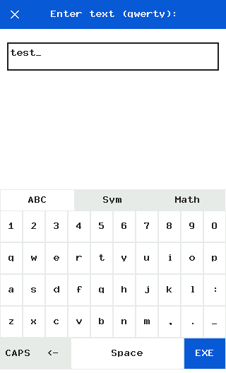 Section titled “cinput.input”cinput.input( prompt, type="alpha_numeric", theme="light", layout="qwerty", touch_mode=gint.KEYEV_TOUCH_DOWN)The single most helpful function. Pauses everything, throws up a full screen modal with a modern-looking on-screen keyboard, and returns the result (or None if the user cancel).