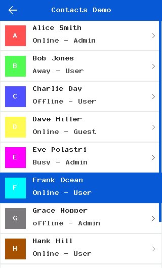 rect: Tuple(X, Y, W, H)of the screen bounds.items: A list of dictionaries{'text': 'Item', 'type': 'item', 'arrow': True}or section headers{'text': 'Settings', 'type': 'section', 'height': 30}update(events): Pass the result ofpollevent()here. It handles dragging and clicks. It returns('click', index, item)if pressed!draw(): Renders all visible sections instantly.