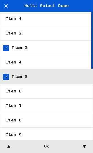 Section titled “cinput.pick”cinput.pick( options, prompt="Select:", theme="light", multi=False, touch_mode=gint.KEYEV_TOUCH_DOWN)When dealing with a finite number of choices to pick, give the users a list. It pops up a fast, inertial-scrolling list taking over the screen.