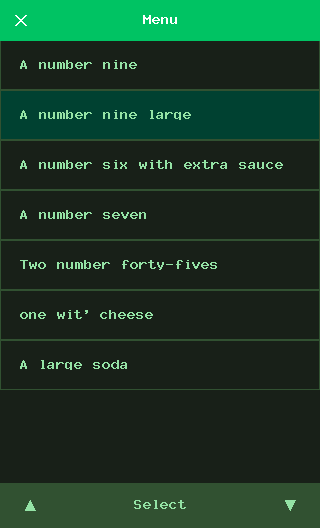 # 3. Pull it out anywhere!cinput.pick(["A number nine", "A number nine large", ...], "Menu", theme="toxic")